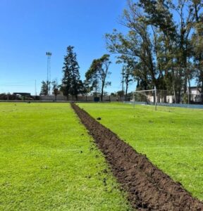 El club Sarmiento de Etruria avanza en obras en su cancha principal de primera división y suma riego artificial distribuyendo agua de forma uniforme y localizada para un mejor mantenimiento del mismo.